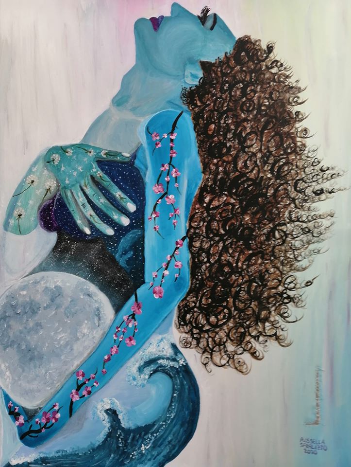 Created in 2020, during a time of uncertainty, the work conveys a message of positivity and rebirth. The female figure, surrounded by nature, symbolizes the strength and delicacy of the human soul. The cherry blossoms, an emblem of rebirth, and the moon, a symbol of hope and connection to the universe, complete this composition that invites the viewer to look to the future with optimism.